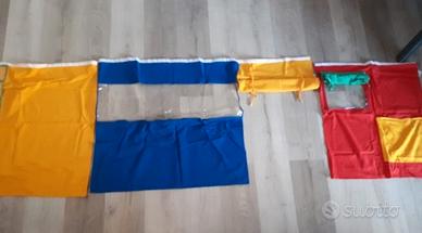 Letto singolo Flexa semi elevato con scala inclinata e scivolo. Il letto si presenta come in foto ma con i colori dei tendaggi blu, giallo rosso e verde