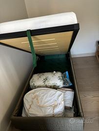 Letto singolo con materasso e contenitore come da foto completamente sfoderabile con 2 cuscini come rivestimento . Misure 90x215.Trasporto a carico dell’acquirente.