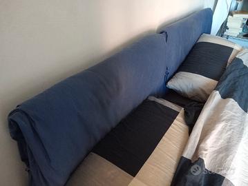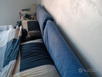 Testata e base sono rivestiti in stoffa blu, completamente sfoderabile e lavabile grazie a pratiche chiusure in veltro. Dimensioni 210x 178 cm, altezza base 30cm, testata 95cm.