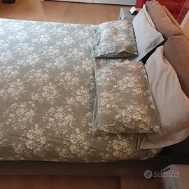 La struttura del Letto è in rete a doghe con piedini in legno, la testata composta da schienale imbottito e da due cuscini completamente sfoderabili e lavabili.