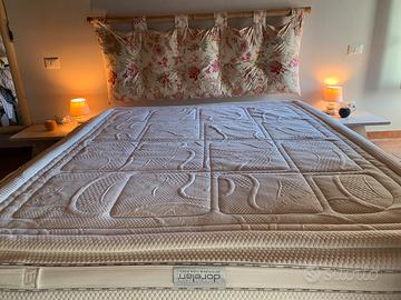 Accoglie un materasso di dimensioni king size 180x200 . Ingombro massimo della struttura letto 240x220 altezza circa 30 cm da terra