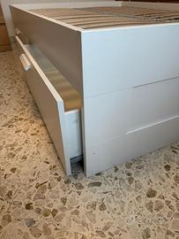 Letto "Brimnes" di ikea, cm 140×200, bianco, con 4 ampi cassetti contenitori, completo di rete a doghe in legno e materasso Matrand in schiuma, semirigido, prezzo totale € 300 (presenza di qualche piccolo graffio in corrispondenza delle maniglie dei cassettoni, come visibile dalle foto)
