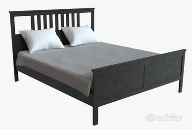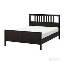 Vendo struttura letto modello IKEA IDANÄS (160×200 cm) in finitura marrone-scuro, con testiera a doghe verticali in legno, gambe robuste e design elegante che si integra in camere da letto moderne.