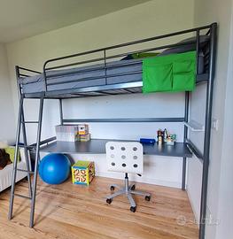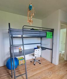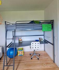 Vendo letto a soppalco in metallo, robusto e salvaspazio, perfetto per camerette o stanze studio. Sotto il letto è integrata una scrivania spaziosa con ampio piano d’appoggio, ideale per studiare o lavorare. Incluso materasso in ottime condizioni.