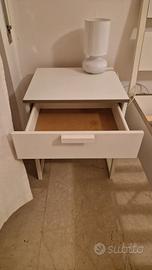 Letto matrimoniale IKEA TRYSIL e comodini della stessa linea .La struttura del letto e dei comodini è di colore bianco, con piccoli dettagli marroni (come da fabbricazione). Il letto monta una rete a doghe LURÖY con la trave mediana SKORVA. La struttura del letto è compatibile con diversi tipi di materassi.