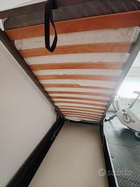 Letto singolo imbottito in cotone blu scuro con contenitore, apertura con pistoni. Materasso 90x190 cm, doghe in legno.
