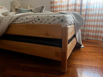 Letti impilabili in legno di pino massiccio. Possibilità di trasformarli in un letto matrimoniale, in due letti singoli o in un divano angolare. Misura 80x200. Materassi venduti separatamente