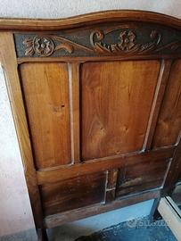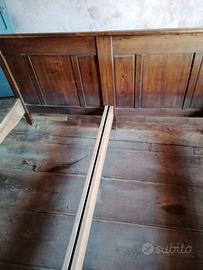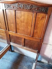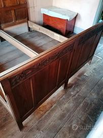Letto matrimoniale, ma si possono fare 2 letti singoli in legno di castagno con intarsi sulle testiera e sulle pediere della fine 800. C'è anche l'etichetta con nr 72 e per chi era stato fatto. Misure: lunghezza 200 cm, larghezza 167 cm, altezza testiera 135cm, altezza pediera 85 cm, larghezza buco per rete 77 cm. Per altre informazioni scrivetemi.