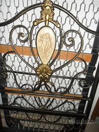 Letto romantico, in ferro battuto, ben conservato, completo di rete. Completo di medaglione di ceramica raffigurante due amorini, di colore beige.