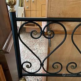 Letto da una piazza e mezzo in ferro battuto artigianale con decorazioni dorate nuovo proveniente da ex mobilificio. Rete non disponibile (eventualmente ho alcune reti abbinabili). Misure: testiera altezza cm. 123 e lunghezza cm. 123; pediera altezza cm. 75 e lunghezza cm. 123