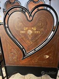 Propongo rarissima ed introvabile struttura in ferro battuto, con i cuori che si incontrano, struttura con meravigliosa patina del tempo! Sono due letti singoli, che uniti formano un letto matrimoniale con misure: Larghezza cm. 190 Lunghezza cm. 205 Altezza parte posteriore cm. 180. Visibile a Castiglione Torinese, in provincia di Torino. No trasporto!