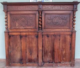 Letto antico in legno buone condizioni da ristrutturare composto da: Testata e fondo letto co le due barre laterali di collegamento. Misure: testata cm LxA 160 x 145, fondo letto cm LxA 160 x 87,5, Barre laterali lunghezza x altezza in cm 195 x 19.