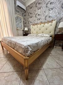 Letto matrimoniale con rivestimento in ecopelle trapuntata color crema e dettagli decorativi in foglia oro.