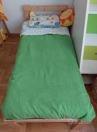 Letto per bambini realizzato artigianalmente in abete trattato solo con impregnante ad acqua. Il letto misura 171 cm di lunghezza x 75 cm di larghezza. viene fornito con materaaso in schiuma di Ikea 160x70, in ottime condizioni, mai bagnato. Consegna solo a mano a Roma in zona San Giovanni. 50 euro