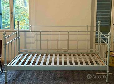 Letto singolo in metallo completo di rete a doghe, Ikea. Azzurro, stile country chic. Montaggio estremamente facile, incluse viteria e istruzioni originali. Condizioni ottime. Lunghezza 210 cm. Con materasso adatto al letto (misure 90x200). Il letto può essere usato anche come divano.