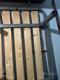 Vendo letto a soppalco con struttura robusta in metallo grigio antracite, ideale per ottimizzare lo spazio in camera o in un monolocale. Il letto è completo di doghe in legno massiccio resistenti e di alta qualità.