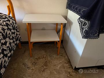 Il comodino coordinato è anch'esso a struttura metallica verniciata colore arancio 50x30x55 (LxPxA) con ripiani in legno, finitura bianca.