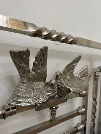 Un pezzo elegante e di alta qualità artigianale, con dettagli decorativi cesellati, colonne tornite e raffigurazioni ornamentali (colombe e teste leonine).