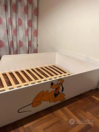 Letto bambino Disney Piazza e mezzo con doghe in legno, stampe laterali di Pluto, Topolino, Pippo e Paperino su sfondo bianco, sponde anti casuta leggermente ante ed ingresso per i piu piccoli.