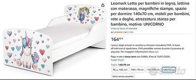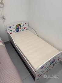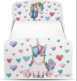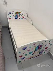 Vendo lettino per bambini a disegno unicorno compreso di materasso in schiuma da 10cm con fodera rimovibile e lavabile e doghe in legno. Molto resistente Dimensioni esterne del letto: 144 x 76 x 65,5 cm Ancora nuovo e in perfette condizioni. P.S. Se ritirato in zona posso farlo trovare ancora montato.
