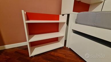 Struttura letto singolo con letto estraibile sottostante. Reti a doghe. Testata con comodino estraibile su ruote. Due materassi singoli cm 90 x 200.