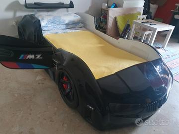 Letto a forma di auto sportiva BMW con telecomando per accendere i fari, le frecce e luci varie, anche vari suoni realistici, porte apribili e funzionanti. Compreso di rete e materasso. Trasporto a carico dell'acquirente