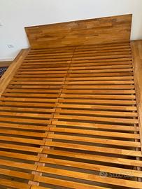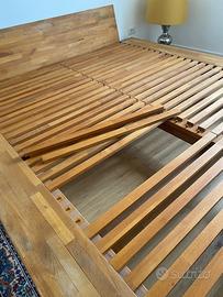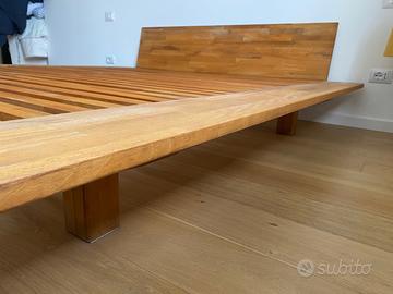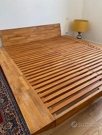 Letto in legno massello di faggio trattato ad olio solo incastri nessun componente metallico. Misure 200x200 per materasso 160X200, come si vede dalla foto rimangono due bordi di 20 cm per lato oltre il matterasso