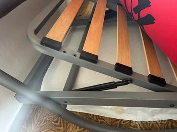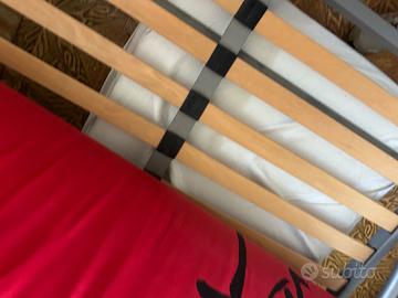 Il letto ha una rete a doghe molto buona con testiera regolabile in altezza. Robusta struttura in lega leggera. Usato. Il materasso è ancora ok - stile futon. Rivestimento lavabile.