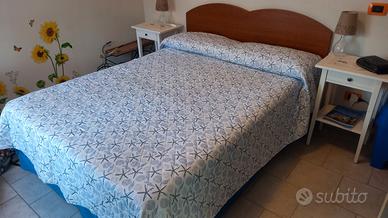 Letto matrimoniale piazza e mezza francese 140x190 composto da rete a doghe, materasso a molle, copri doghe che fa anche da giroletto in tessuto e testiera da fissare al muro in colore ciliegio. La testiera è divisa in 2 pezzi, larga 150 cm. ed è indipendente, ovvero si può anche non mettere. Il materasso non presenta il minimo difetto, no macchie, tagli, strappi ecc... È tutto come nuovo, predisposto in una stanzetta per gli ospiti ma mai utilizzata. Visibile e ritirabile nei pressi di Diano Marina.