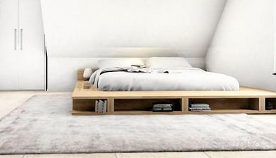 Il letto ha una grande cornice che corre tutt’intorno al materasso e funziona come mensola per appoggiare libri, lampade, telefono, ecc. La base è una vera e propria libreria integrata, con scomparti su tutto il perimetro: ideale per chi ama leggere a letto o vuole una camera essenziale senza tanti mobili aggiuntivi.