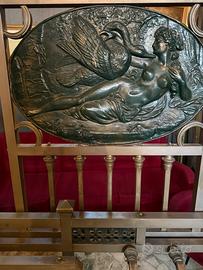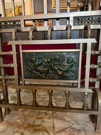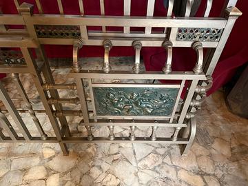Il letto d'epoca é in ottone massiccio, completo di testiera, pediera e aste laterali (longoni) originali. Un pezzo di alta ebanisteria metallica dei primi del XX secolo, caratterizzato da un apparato decorativo di straordinaria qualità scultorea.
