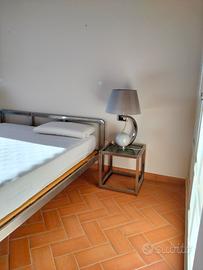 Struttura letto matrimoniale degli anni '70 con giroletto e testiera in acciaio satinato completo di due comodini con piano di cristallo. Presenta un design moderno e minimalista, con linee semplici e geometriche che si adattano bene a uno stile industriale o contemporaneo.