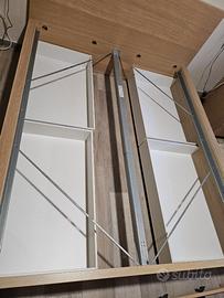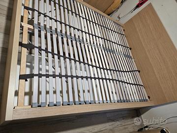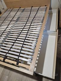 Letto matrimoniale, modello Malm di Ikea, completo di 4 cassettoni con ruote alla base. Solo struttura, completa di rete con doghe di legno, no materasso. Dimensioni 160x200, colore rovere chiaro. In perfetto stato, solo scoloriture sul film bianco dei cassetti dovuto all'età. Venduto smontato, con tutti i pezzi per rimontarlo, rete assemblata (2 parti 80x200) perché non può essere smontata. Da venire a ritirare