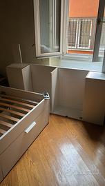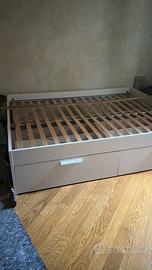 Vendo letto matrimoniale brimnes ikea con testiera ed eventualmente due comodini da abbianare. Il letto è in perfette condizioni, dotato di rete con doghe in legno e 4 cassetti contenitori molto utili per riporre biancheria e coperte. Vedo causa trasloco. Prezzo sul sito 399.