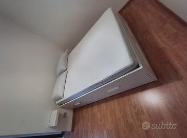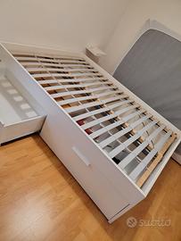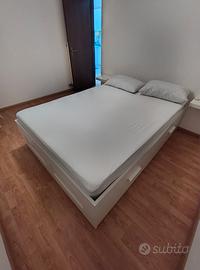 Letto matrimoniale Ikea Brimnes Bianco con cassetti molto grandi e utilissimi. Incluso materasso a molle dedicato Ikea (in ottime condizioni usato poco) e due cuscini, usati pochissimo. Misure: 205,5 cm lunghezza, 146 cm larghezza, 47,5 cm altezza senza materasso, 58cm con materasso. Vendo per trasferimento. Visibile a Tenna montato. Ritiro di persona (smontato e con istruzioni Ikea per il rimontaggio.