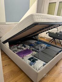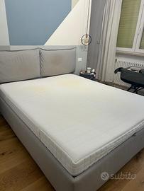 Letto due piazze contenitore Ikea, con testata in tessuto colore grigio, e materasso (160 x 200 cm) incluso nel prezzo. Il letto è in buone condizioni, presenta solo qualche macchia sulla testata.