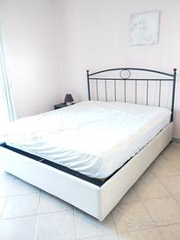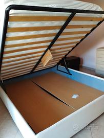 letto con contenitore compreso di materasso, 2 piazze, larghezza 167cm, lunghezza 210cm, altezza 38cm senza materrasso e 58 con materasso, altezza spalliera 120cm, struttura integra, e stato messo un supporto di rinforzo sotto la rete a doghe medie. unico difetto visibile in foto, ovvero la tavola del contenitore leggermente incurvata.. in piu e stato installato un supporto in legno direttamente sulla rete x prevenire la deformazione della struttura, rimovibile in un attimo.. da sanificare.. ritiro zona ponte di nona (RM) prezzo leggermente trattabile.. x info 3801527523