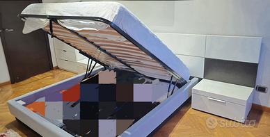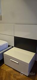 Completo di testata boiserie con pannelli in legno laccati bianco lucido e finitura legno marrone scuro.