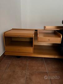 Vendo letto matrimoniale di design con testiera in legno chiaro e moduli contenitori laterali su ruote, con cassetti e ripiani integrati.