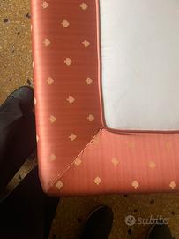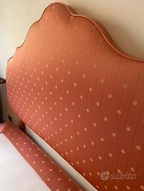 Vendesi elegante struttura per letto matrimoniale in stile classico, composta da un'ampia testata sagomata e giroletto coordinato. Il letto è interamente imbottito e rivestito in un pregiato tessuto damascato color rosa pesca/antico, impreziosito da delicati ricami dorati a contrasto.