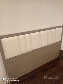 Il letto è in legno con testata imbottita in ecopelle bianca.