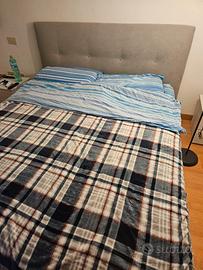 Testiera e bordo letto rivestiti in tessuto grigio in perfette condizioni.