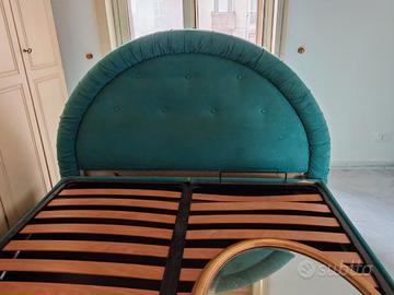 * Design Unico: Testiera imbottita di forma semicircolare/a conchiglia, rivestita in un elegante velluto color verde tiffany scuro. I dettagli della testiera, con la balza arricciata e i bottoni, conferiscono un tocco vintage e sofisticato (vedi foto).