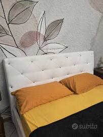 Letto matrimoniale mod Luxury con contenitore e rete a doghe, ecopelle bianco con bottoni swarowsky