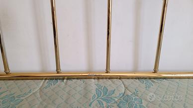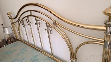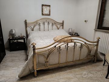 Vendo letto matrimoniale in ottone , marca Barel placato 24 kt. Il letto è in buono stato, vi sono solo dei graffi superficiali alla testiera che non compromettono l'estetica, poichè si coprono con i cuscini. Il letto si vende comprensivo di rete con doghe in legno e materasso in buone condizioni.