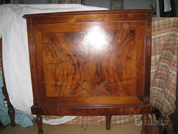 Letto matrimoniale inizio '900 formato da 2 testiere, 2 pediere e traverse di collegamento tra di esse. Le reti non ci sono. Struttura in noce e pannelli di noce fiammata. Misure di una singola testiera larghezza 102 cm incluso la cornice (90 cm. circa senza cornice) , altezza 162 cm. La pediera larghezza 91 cm., altezza 97 cm.