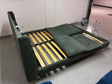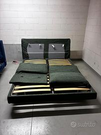 Vendo letto matrimoniale di design della marca italiana Biba Salotti, in tessuto verde scuro con struttura imbottita e rete a doghe in legno inclusa.