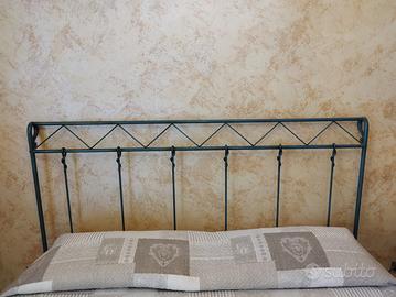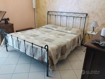 Letto matrimoniale di ferro battuto artigianale comprensivo di rete a doghe e corredato da comodino e abat-jour in stile, laccato blu/celeste antichizzato e decorato a mano