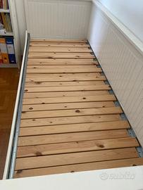 come nuovo! letto ikea come in foto smontato, senza materasso il letto ha 3 cassetti grandi, le doghe sono perfettamente intatte e funzionano a incastro, quindi sia per letto singlo o divano sia apribili a letto matrimoniale