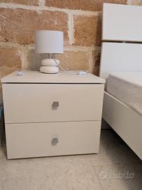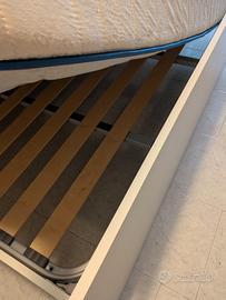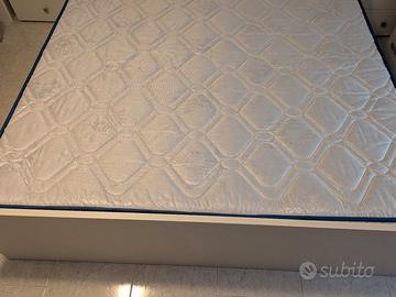 Letto matrimoniale, struttura effetto legno bianco con base integrata in doghe. Materasso matrimoniale ortopedico. Due comodini. Tutto in ottimo stato. Come nuovo.